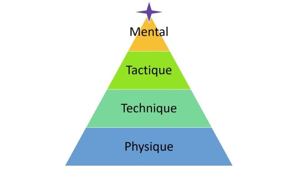 La pyramide met bien en évidence que le mental est au sommet : il est le plus “léger” en volume d’entraînement quotidien, mais c’est souvent ce qui fait la différence en finale de compétition.